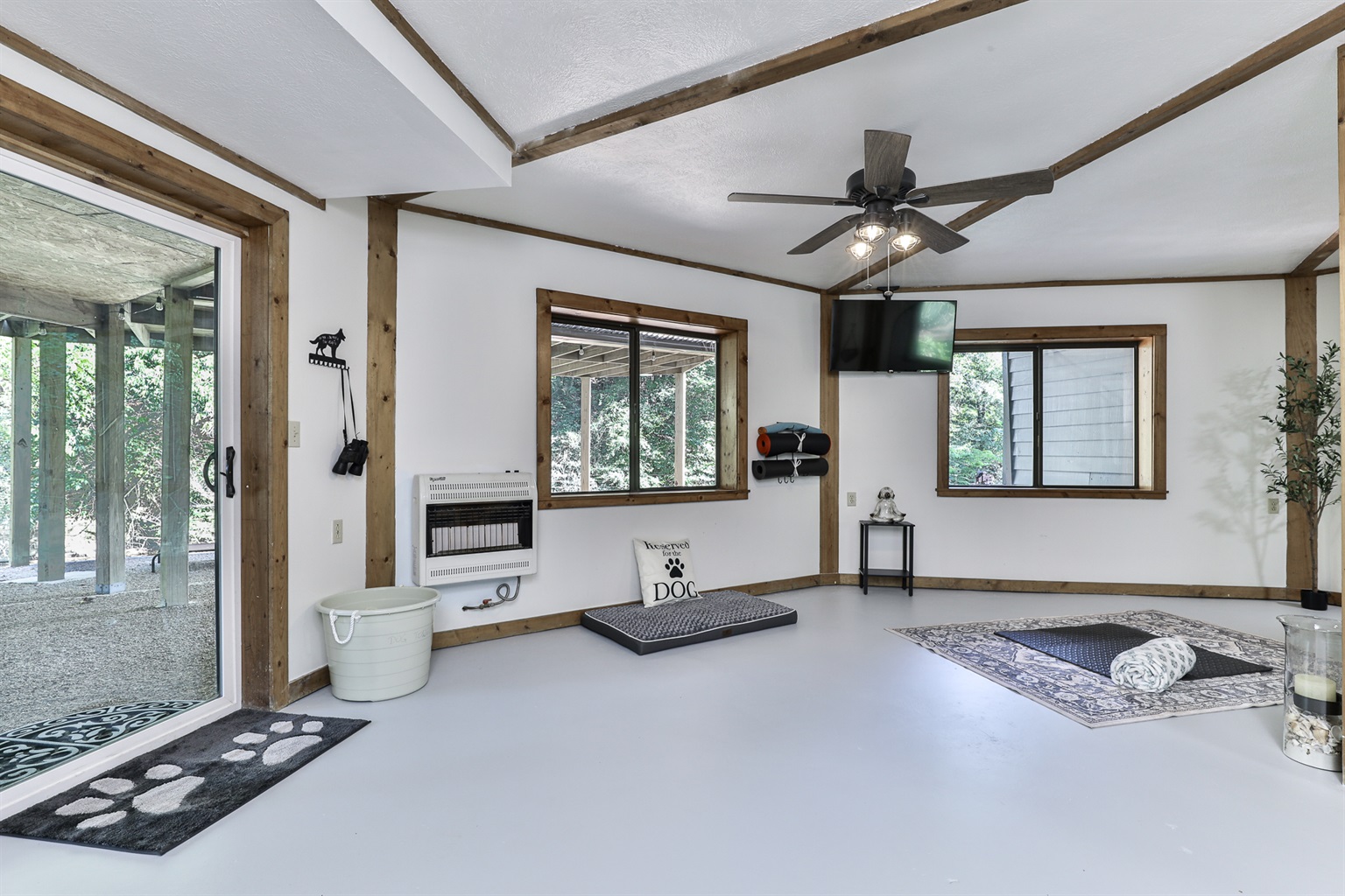 The open-concept living area includes leather recliners, a 65" ROKU TV with complimentary YouTubeTV, and a cozy original “Fisher” wood-burning fireplace. The fully equipped kitchen boasts all-new LG Smart appliances, a selection of cold beverages in the fridge, a well stocked pantry, coffee and tea station, and even a bar for mixing up your favorite drinks. Step outside to enjoy the river view from the back deck or unwind in the basement’s wellness area, featuring a yoga space, weights, workout bench, infrared sauna with bluetooth, LED lights, and zero gravity chairs.